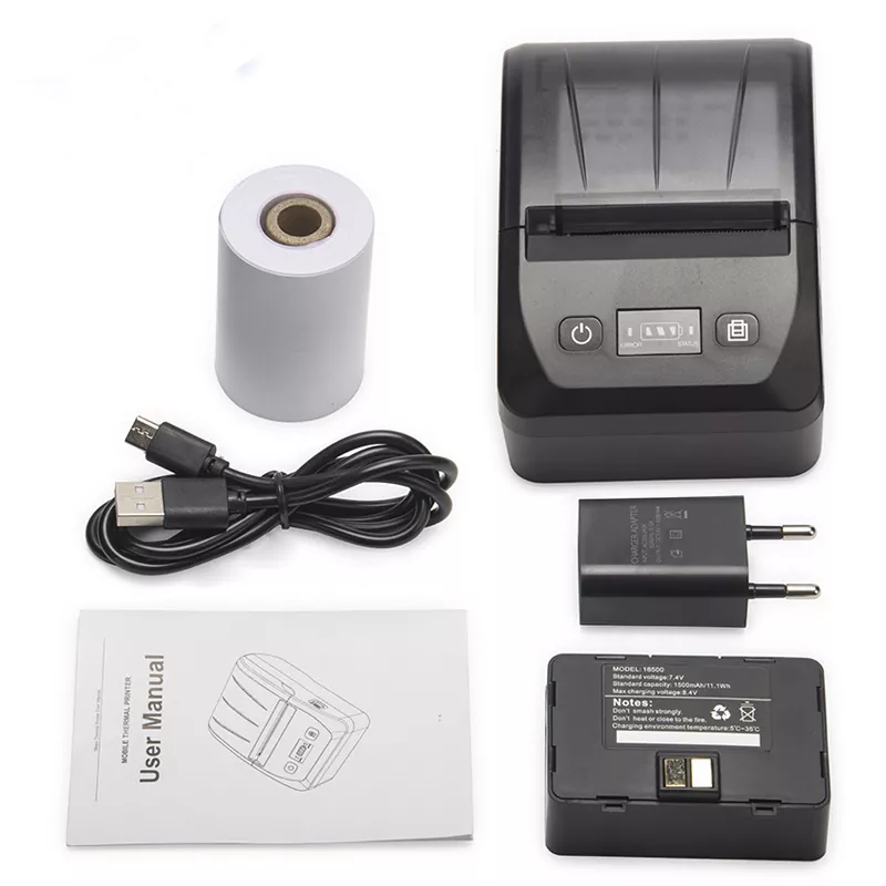 It has a standard Bluetooth + USB dual interface, compatible with Android, iOS, Windows, and ESC/POS commands. The complete accessories include: USB charging cable, power adapter, paper roll, and user manual.